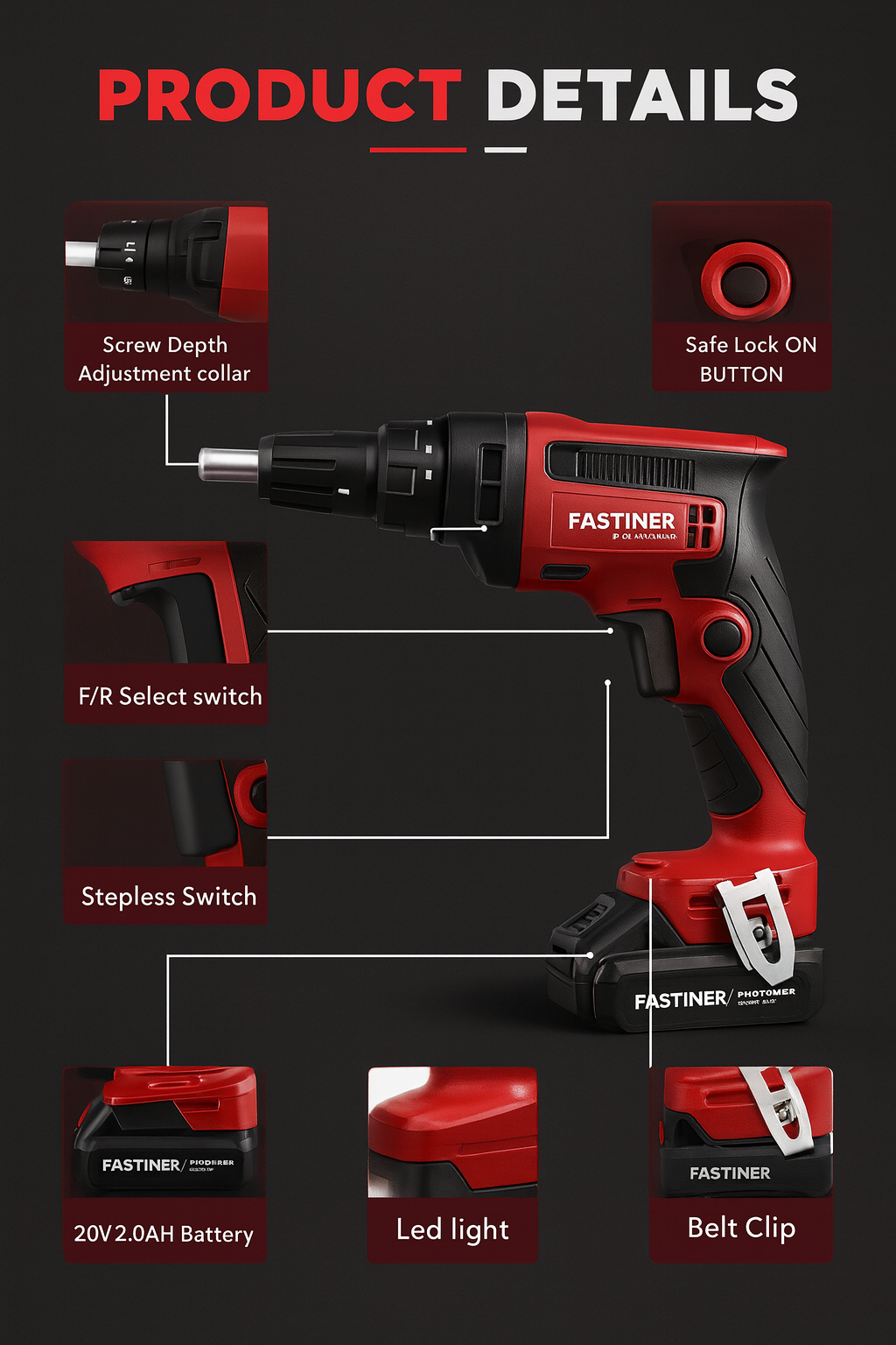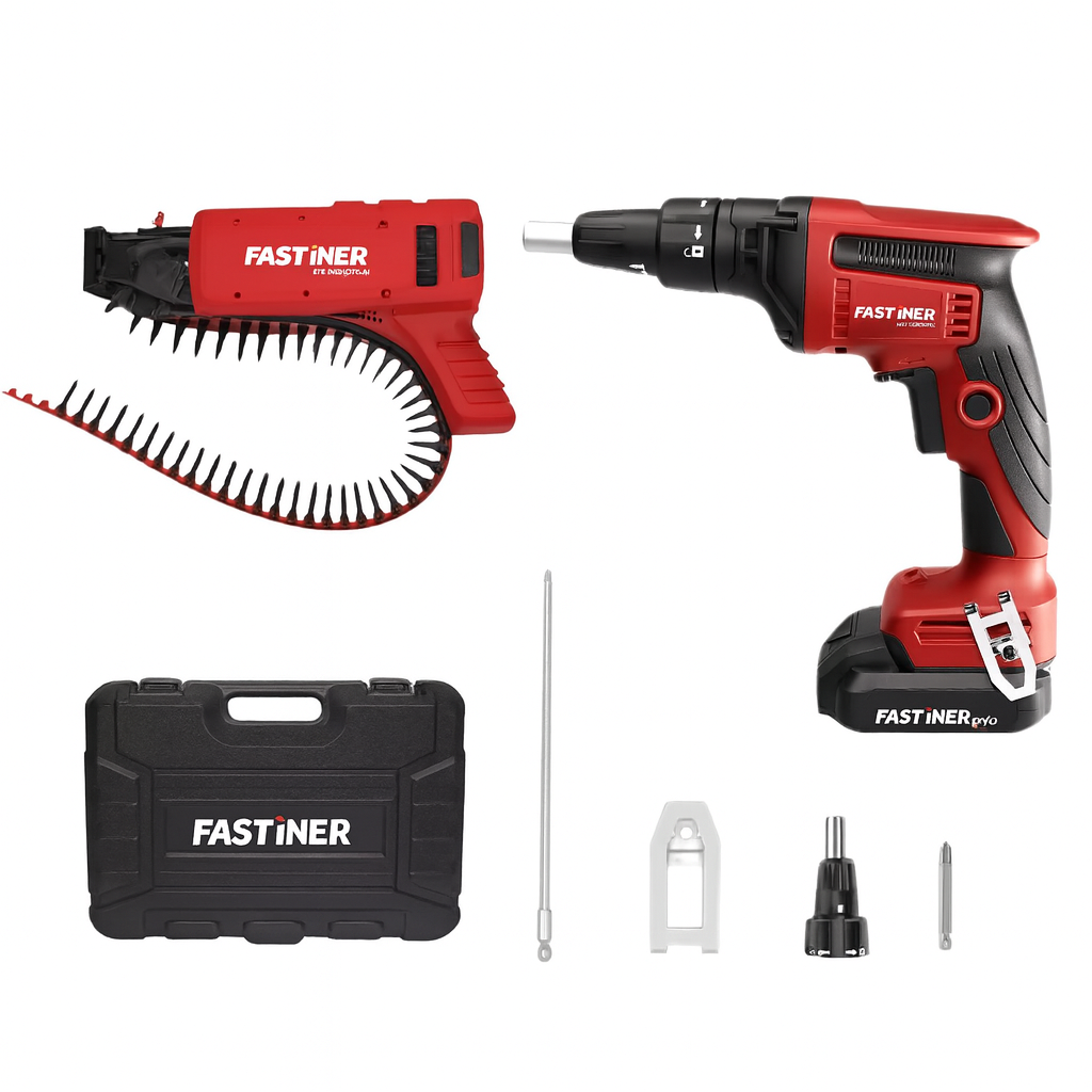 The FASTINER Professional Cordless Screwdriver Kit is engineered for speed, precision, and reliability in drywall installation and light fastening work. Designed for professional installers, this tool delivers consistent screw depth, smooth control, and long-lasting performance on the jobsite.