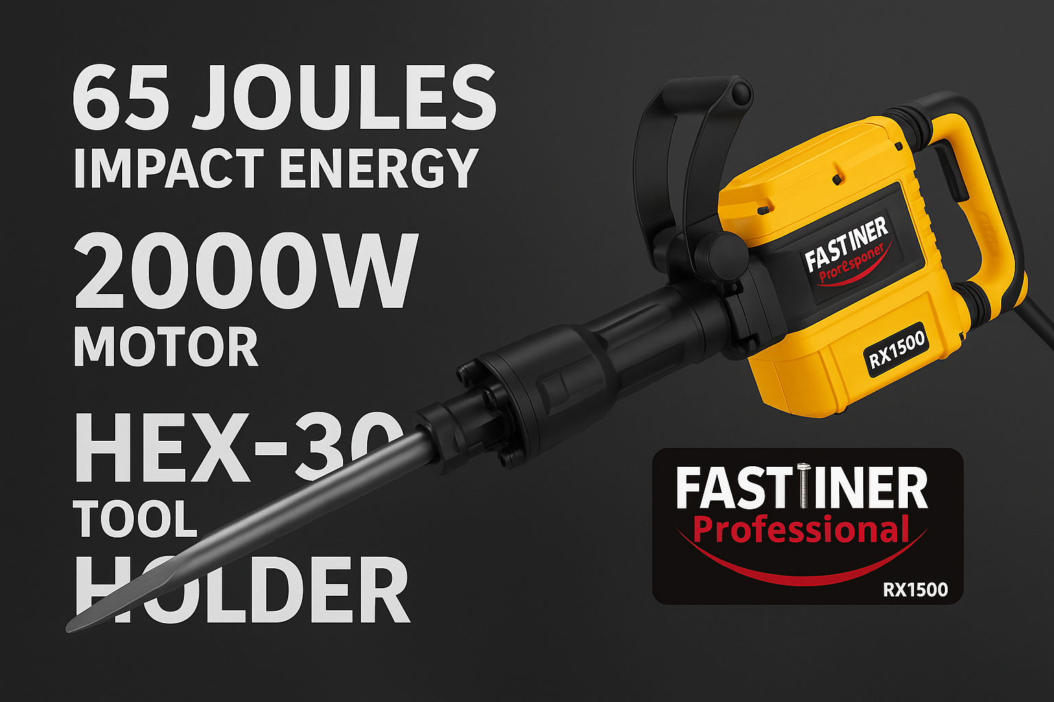 The FASTINER Professional RX1500 Demolition Breaker is engineered for extreme demolition applications where maximum power and durability are required. Designed for professional contractors and industrial job sites, the RX1500 delivers outstanding impact energy, stability, and long-term reliability.