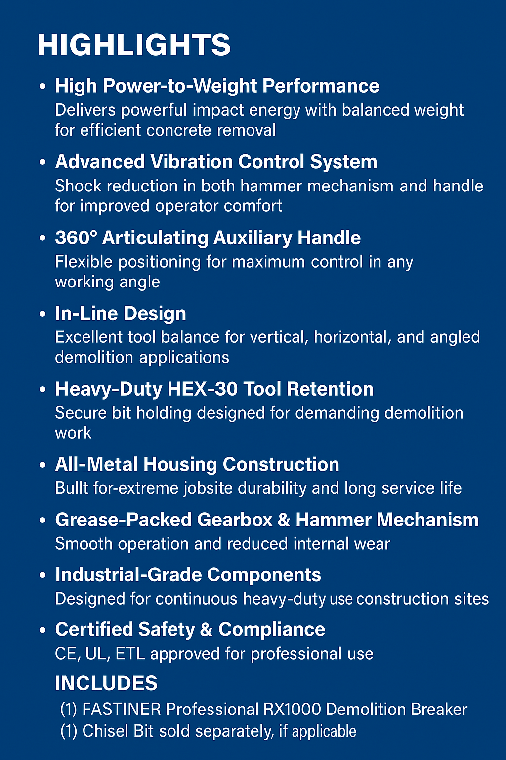 The FASTINER RX1000 is a high-performance demolition breaker engineered for demanding concrete and demolition applications. Built for durability and continuous jobsite use, it delivers powerful impact energy with excellent control and reliability.